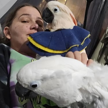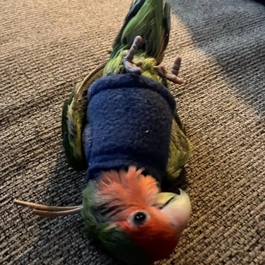 This item arrived late due to the snow storm, but it fits my lovebird perfectly. I am using it along with more dust to try and relieve whatever is making her pluck. It was a fight to get it on, but since she’s had it on she has calmed down and enjoyed me scratching her neck. She still doesn’t want to walk with it on, but I think she will come around. It literally fits her perfect. And I tightened the drawstring so she couldn’t get her beak under it and bite it.